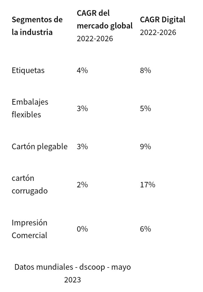 En la siguiente tabla podemos hacernos una idea clara de la dinámica de los mercados de envases. Las cifras recientemente compartidas en dscoop demuestran un crecimiento global general, y las tecnologías digitales experimentan un aumento más pronunciado.